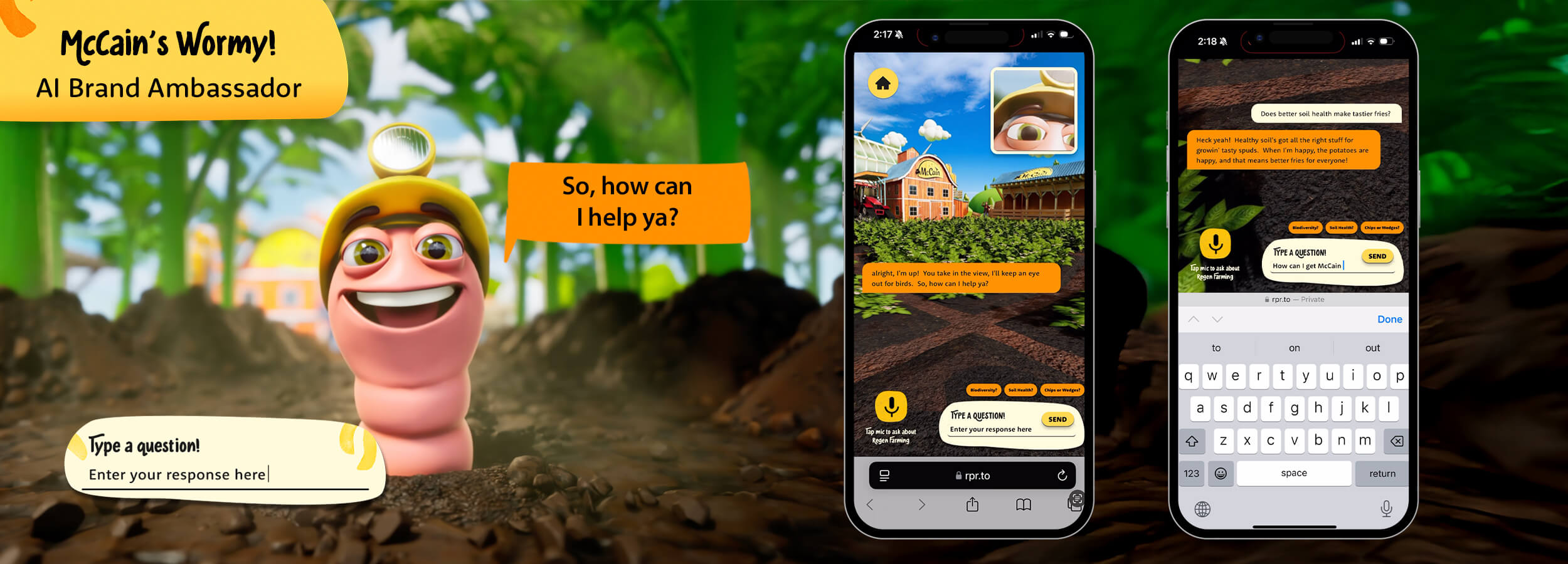 Meet Wormy and Vera, two friendly and knowledgeable McCain Foods ambassadors teaching about regenerative agriculture inside a gamified AR experience.